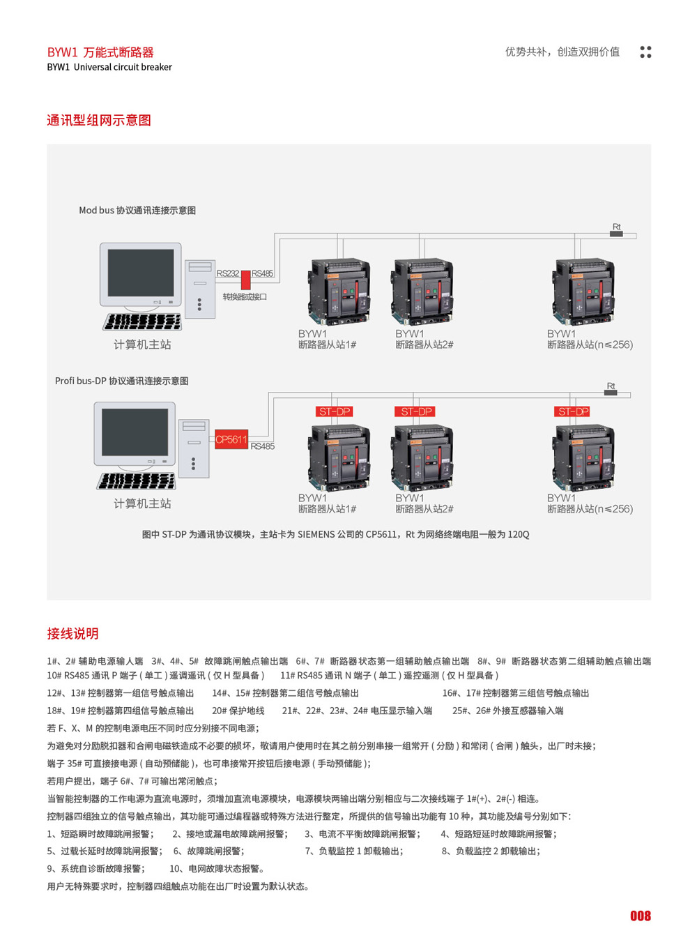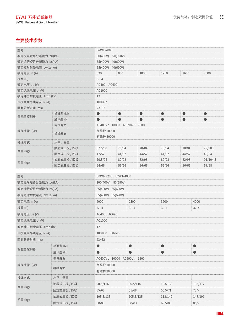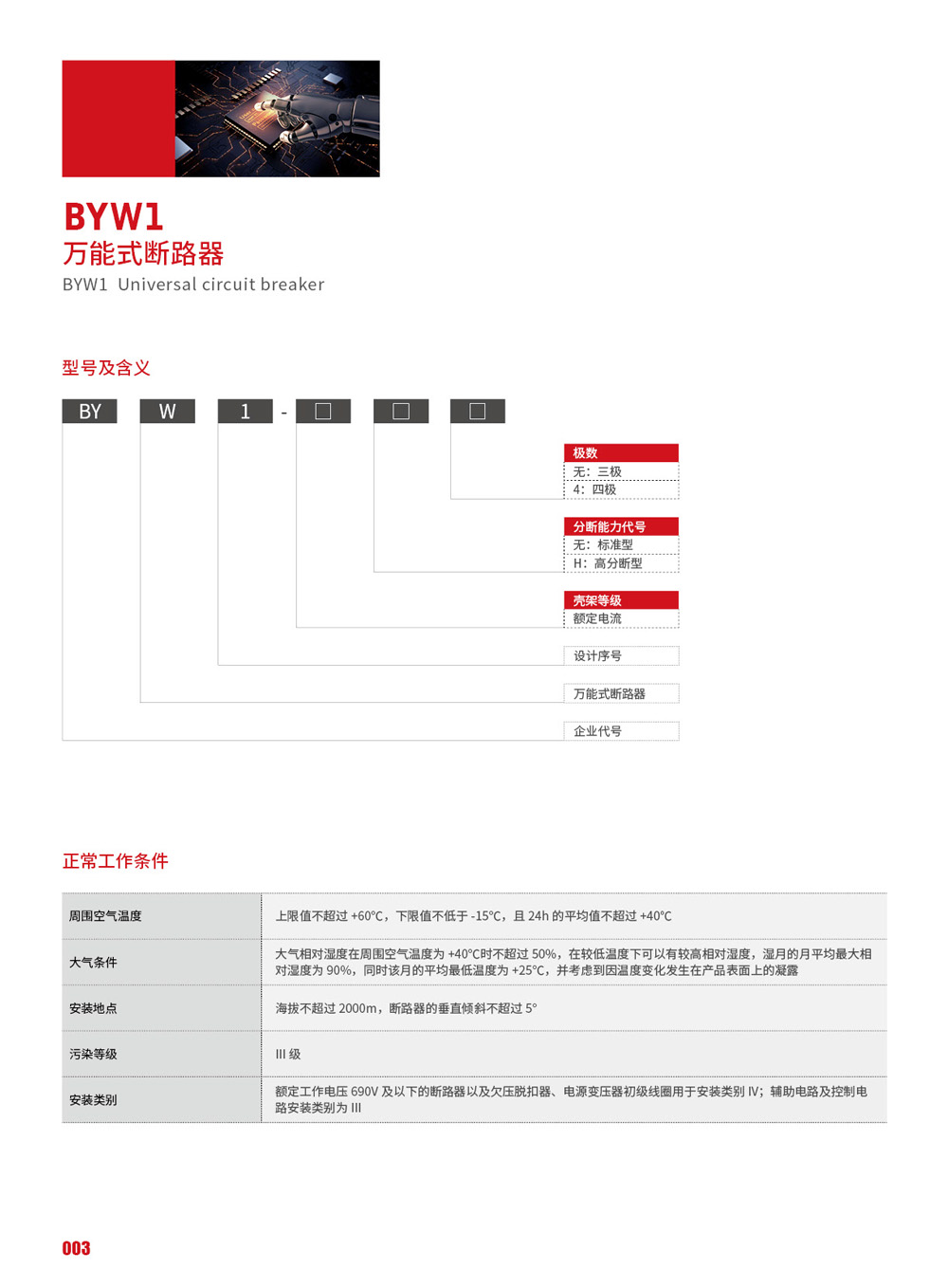 BYW1 系列万能式断路器(以下简称断路器),适用于交流50Hz,额定工作电压至 690V及以下额定电流 200A-6300A的配电网络中,用来分配电能和保护线路及电源设备免受过载、欠电压、短路、单相接地等故障的危害,断路器具有智能化保护功能,有较高精度的选择性保护,提高“遥讯”、了供电可靠性。同时带有标准的 RS485 通讯接口,可进行“测”、“遥控”、“遥调”四遇功能,以满足控制中心和自动化系统的要求。该系列断路器具有结构紧凑、分断能力高、无飞弧距离等特点。断路器不带智能脱扣器及传感器时可作隔离开关用,标示为一个*。