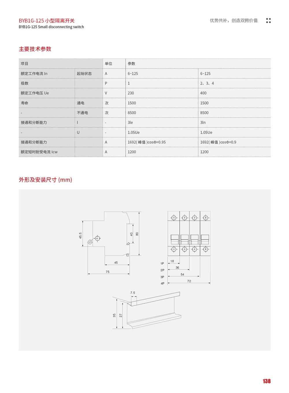 BYB1G-125 小型隔离开关(以下简称开关)适用于交流 50Hz,额定电流 125A 及以下,额定电压至 400V的配电和控制电路中,主要作为终端组合电器中的总开关,也可用于不频繁控制各类小功率电器和照明,广泛应用于工矿企业、高层建筑、商业及家庭等场所。符合标准:GB14048.3、IEC60947-3。