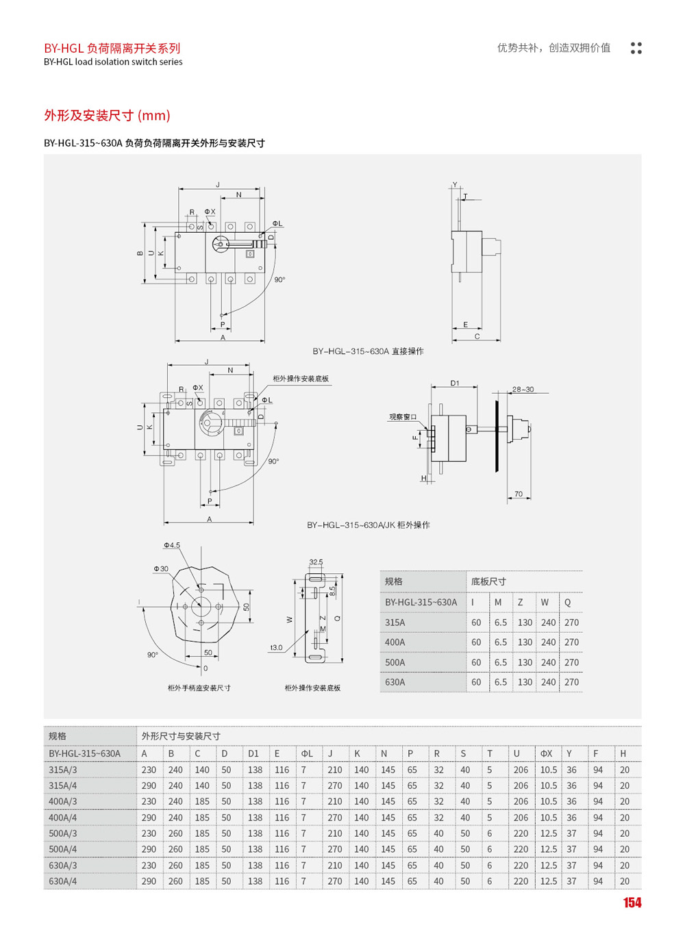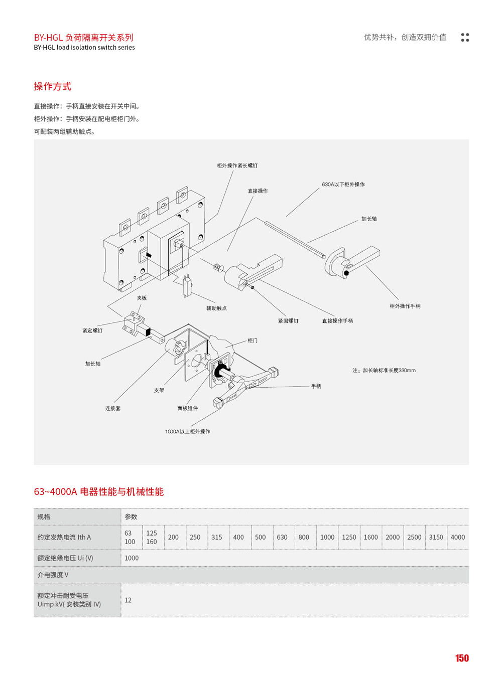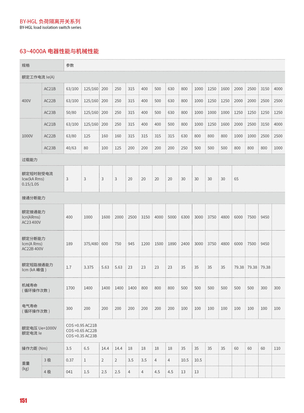 BY-HGL系列负荷隔离开关从 63-4000A分18个规格是模块化设计基础型,具有三极,四极(三极+可通断中性极),适用于电路和接通与分断或电气隔离,1000A以上只做电气隔离。交流50 赫兹,颜定电压至 1000V,直流额定电压至 440V,额定电流至 4000A。用于不频繁接通与分断电路。