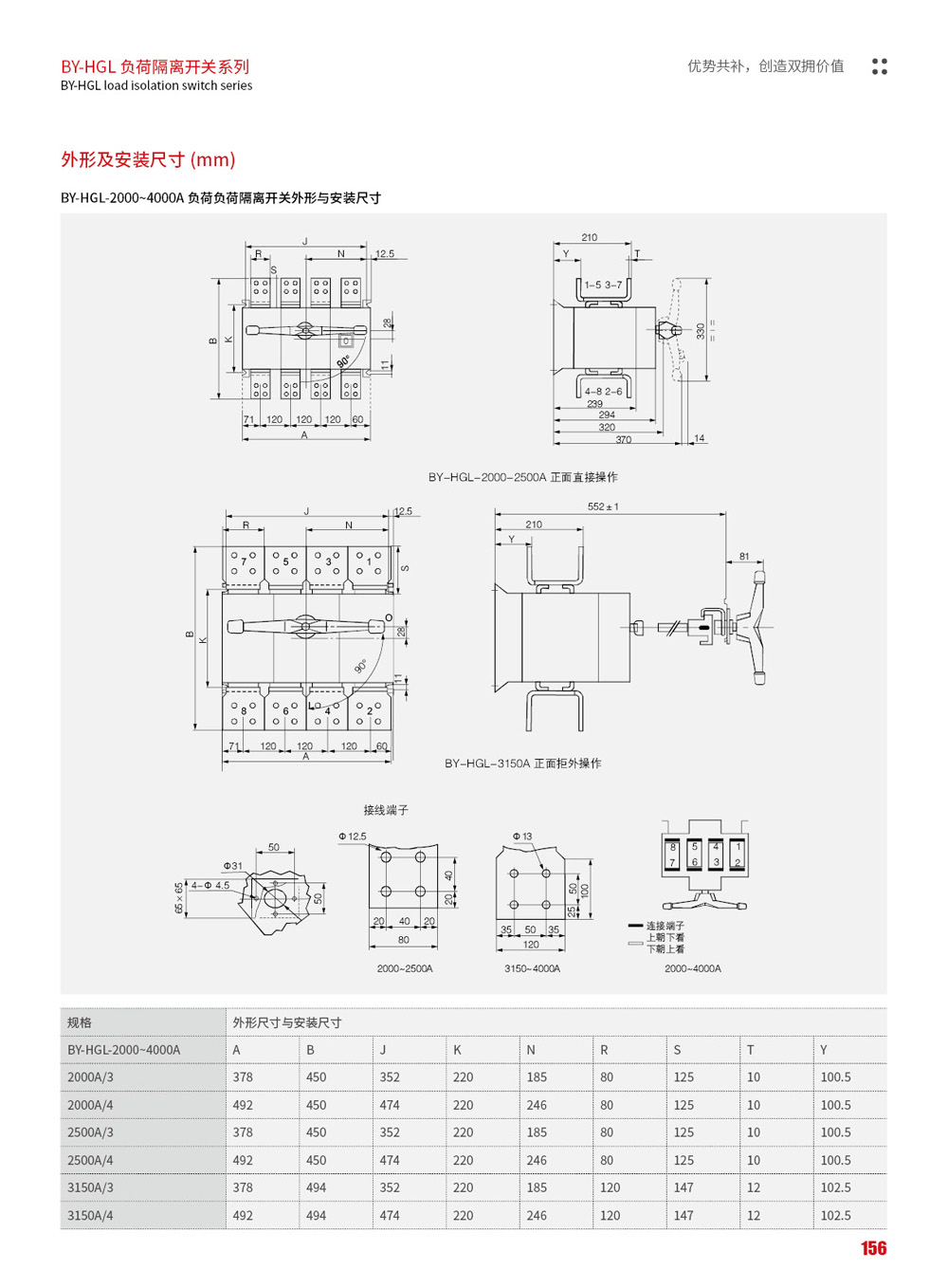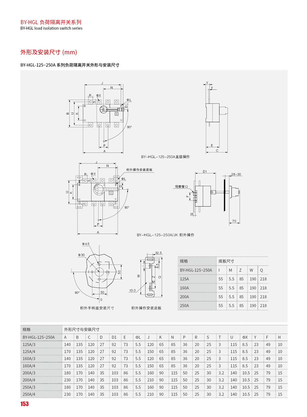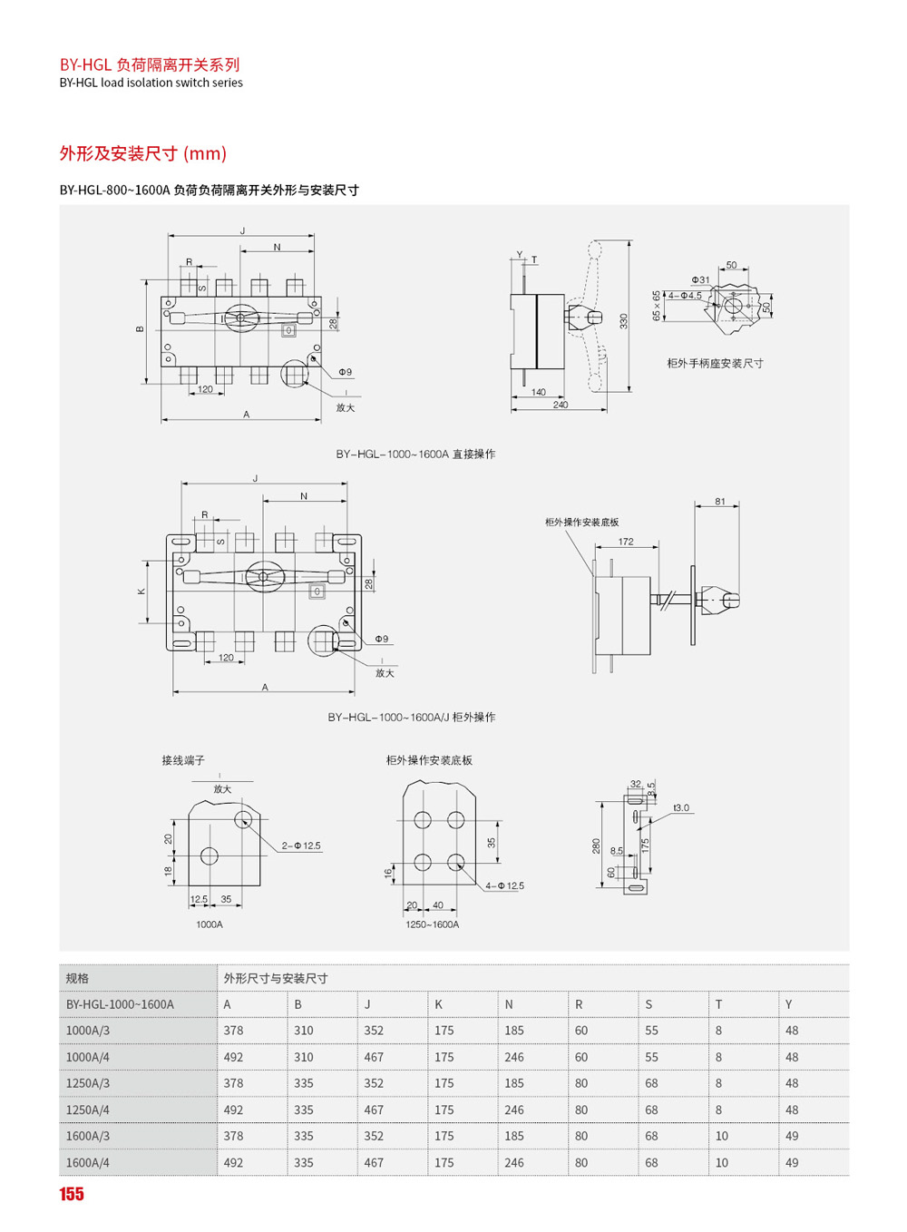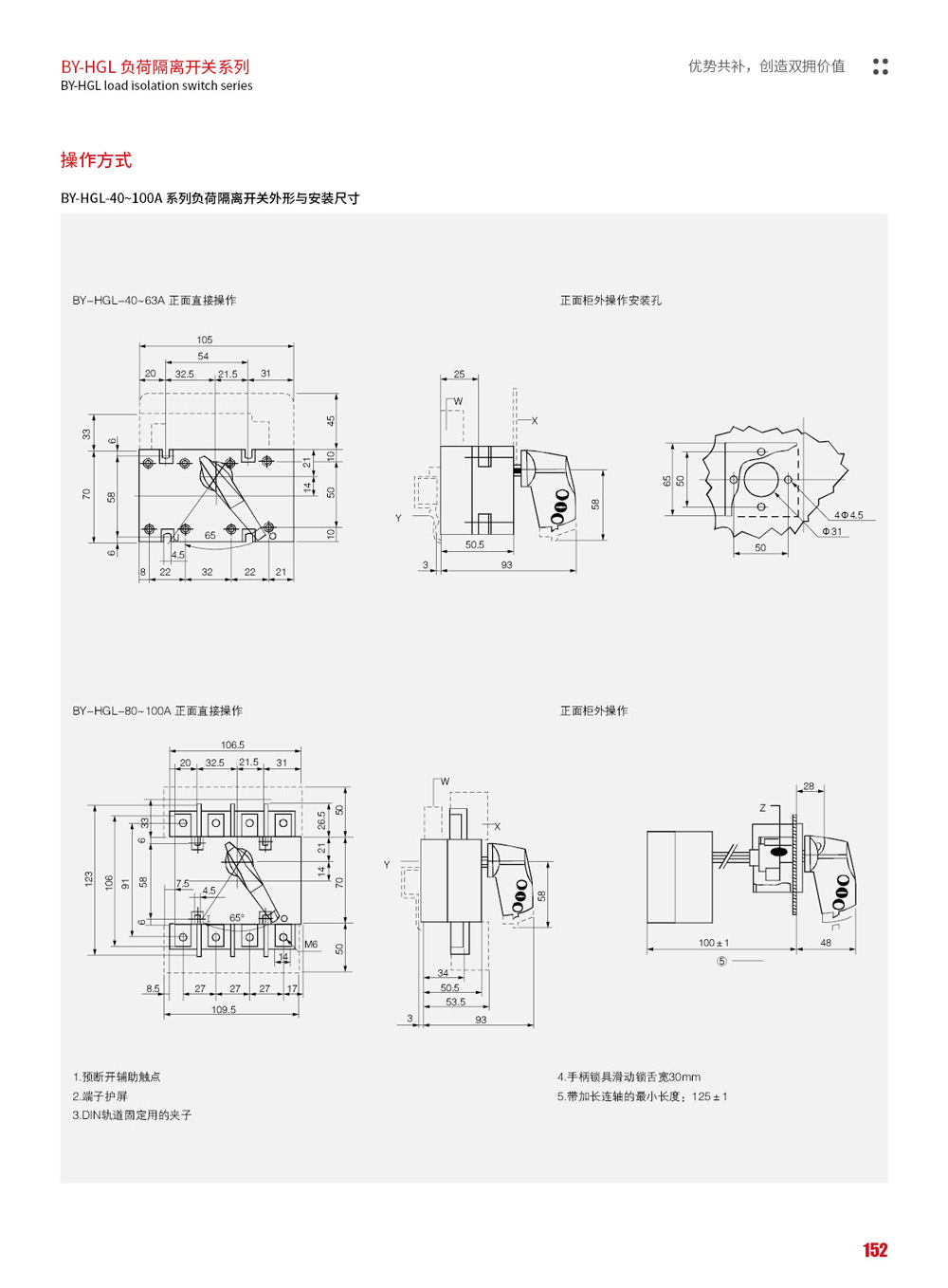 BY-HGL系列负荷隔离开关从 63-4000A分18个规格是模块化设计基础型,具有三极,四极(三极+可通断中性极),适用于电路和接通与分断或电气隔离,1000A以上只做电气隔离。交流50 赫兹,颜定电压至 1000V,直流额定电压至 440V,额定电流至 4000A。用于不频繁接通与分断电路。