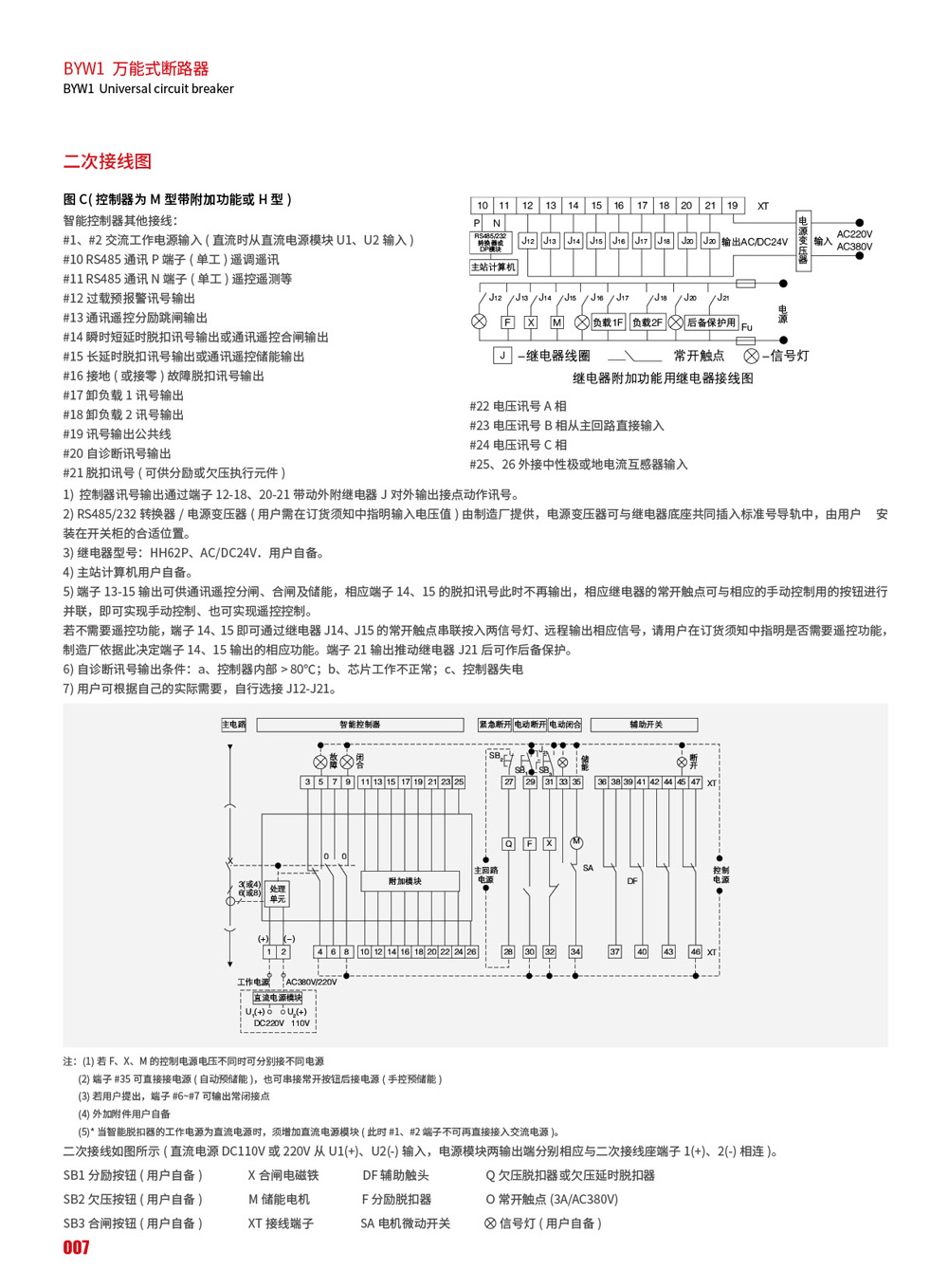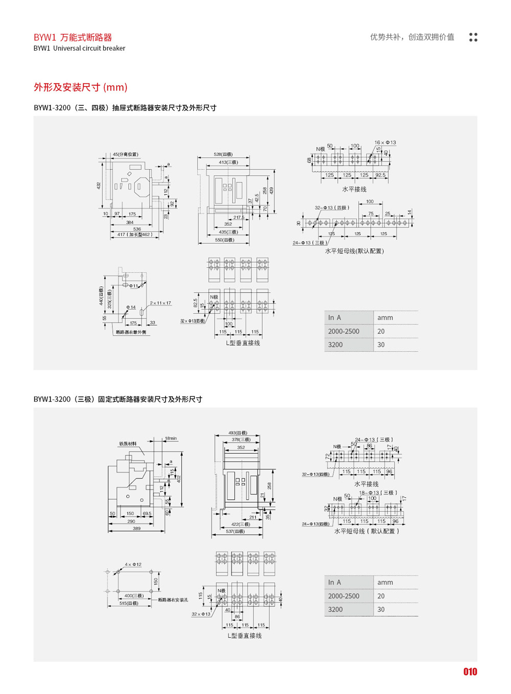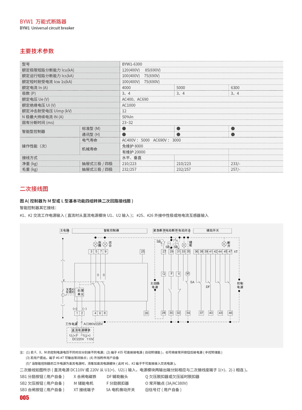 BYW1 系列万能式断路器(以下简称断路器),适用于交流50Hz,额定工作电压至 690V及以下额定电流 200A-6300A的配电网络中,用来分配电能和保护线路及电源设备免受过载、欠电压、短路、单相接地等故障的危害,断路器具有智能化保护功能,有较高精度的选择性保护,提高“遥讯”、了供电可靠性。同时带有标准的 RS485 通讯接口,可进行“测”、“遥控”、“遥调”四遇功能,以满足控制中心和自动化系统的要求。该系列断路器具有结构紧凑、分断能力高、无飞弧距离等特点。断路器不带智能脱扣器及传感器时可作隔离开关用,标示为一个*。
